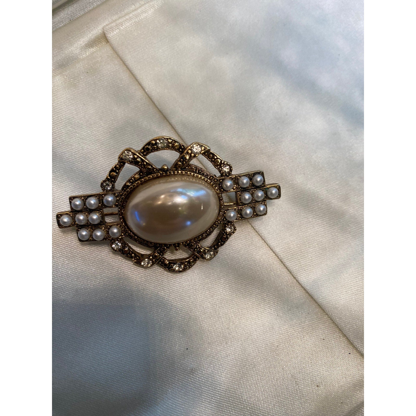 Gold tone faux milky white pearl filigree brooch Victorian design