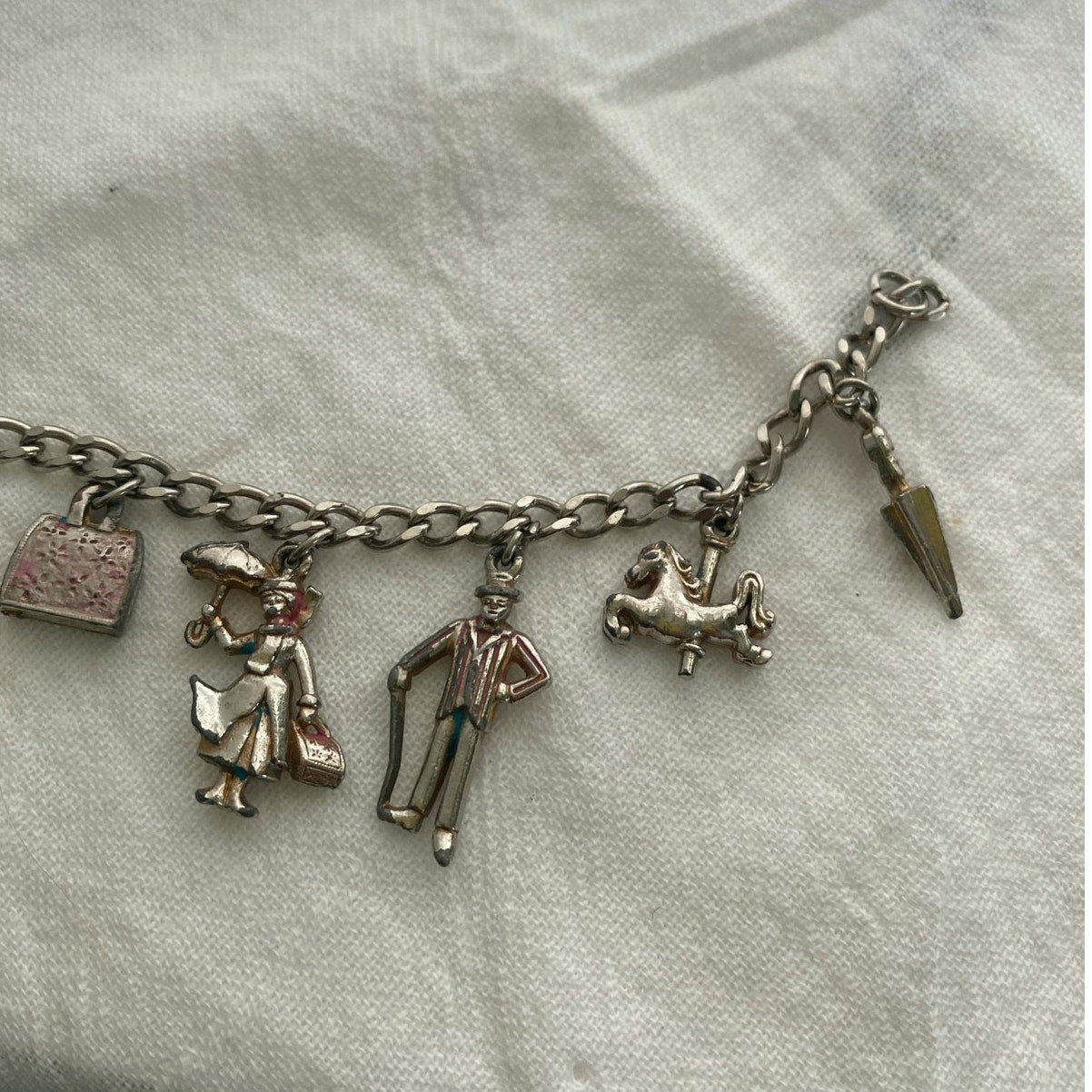 Step back in time with this enchanting vintage Disney Mary Poppins charm bracelet from the 1960s! Released to celebrate the beloved film the Silvertone bracelet features all five original charms Mary Poppins with her umbrella and carpet bag Bert chimney sweep a carousel horse Mary’s magical carpet bag and her signature umbrella. Each charm is full of nostalgic detail, making this bracelet, a true collectors treasure for Disney fans and charm bracelet enthusiast a light. Authentic vintage 1960s Disney Mary Poppins bracelet. Five original dangling charms. Silver tone metals with traces of original enamel, length approximately 7.5 inchescondition. Good vintage condition with some age related wear a rare piece of Disney history perfect for collectors or as a women’s gift for someone who adores Mary Poppins.